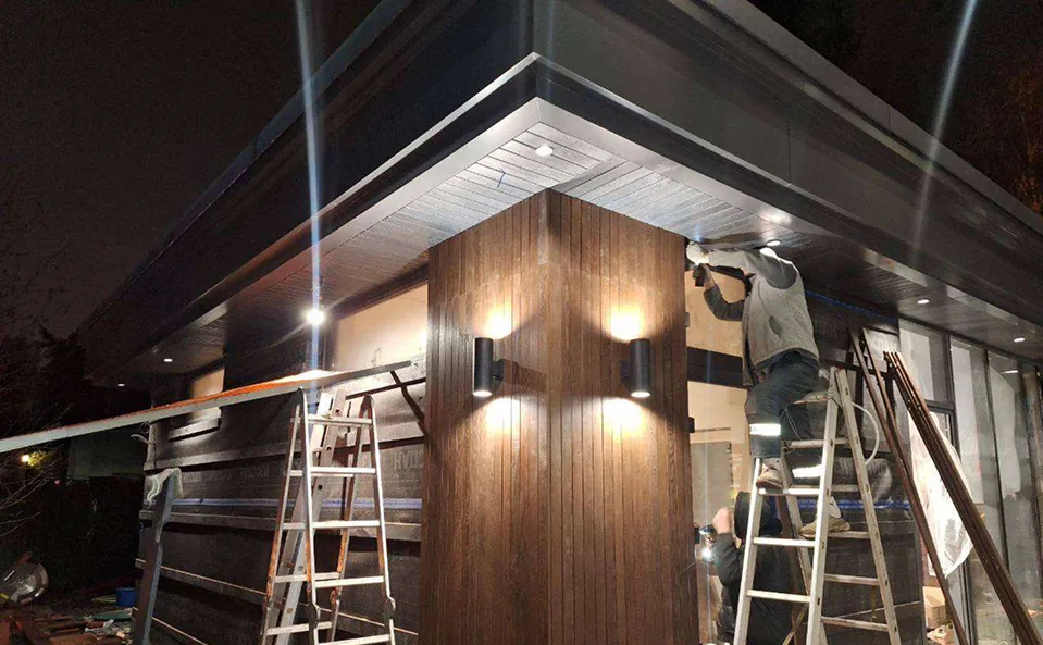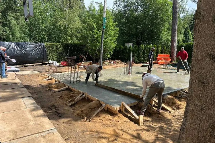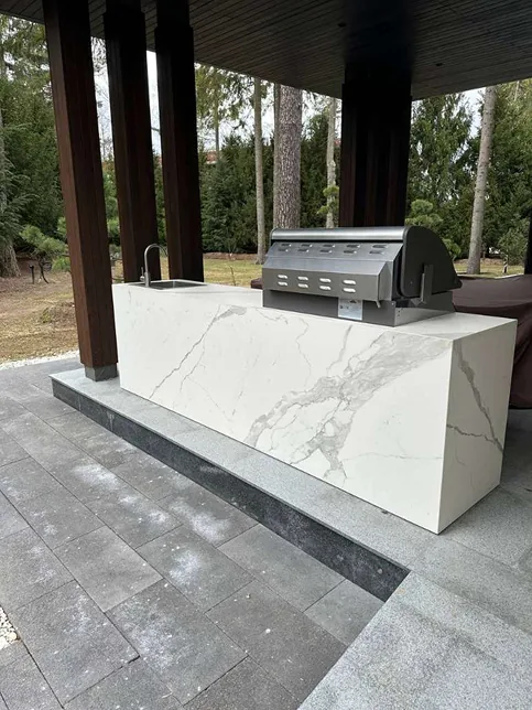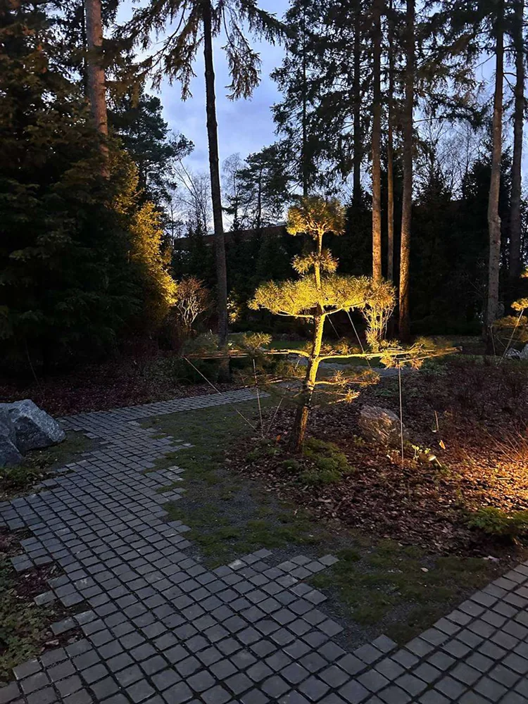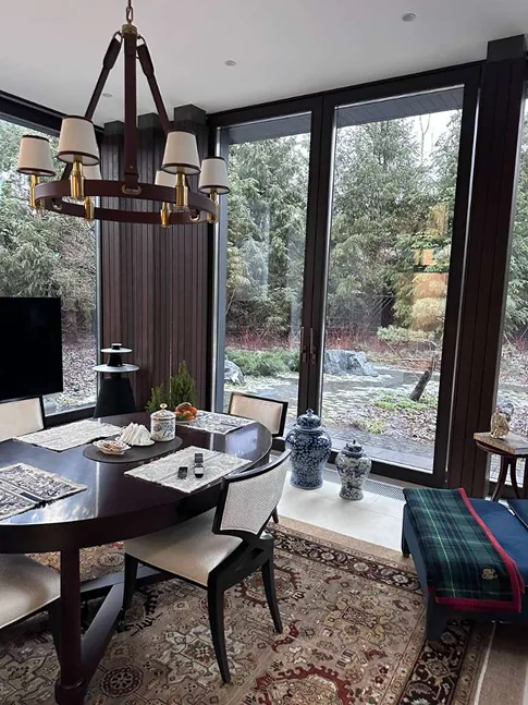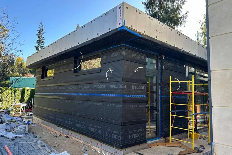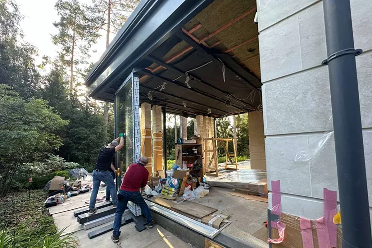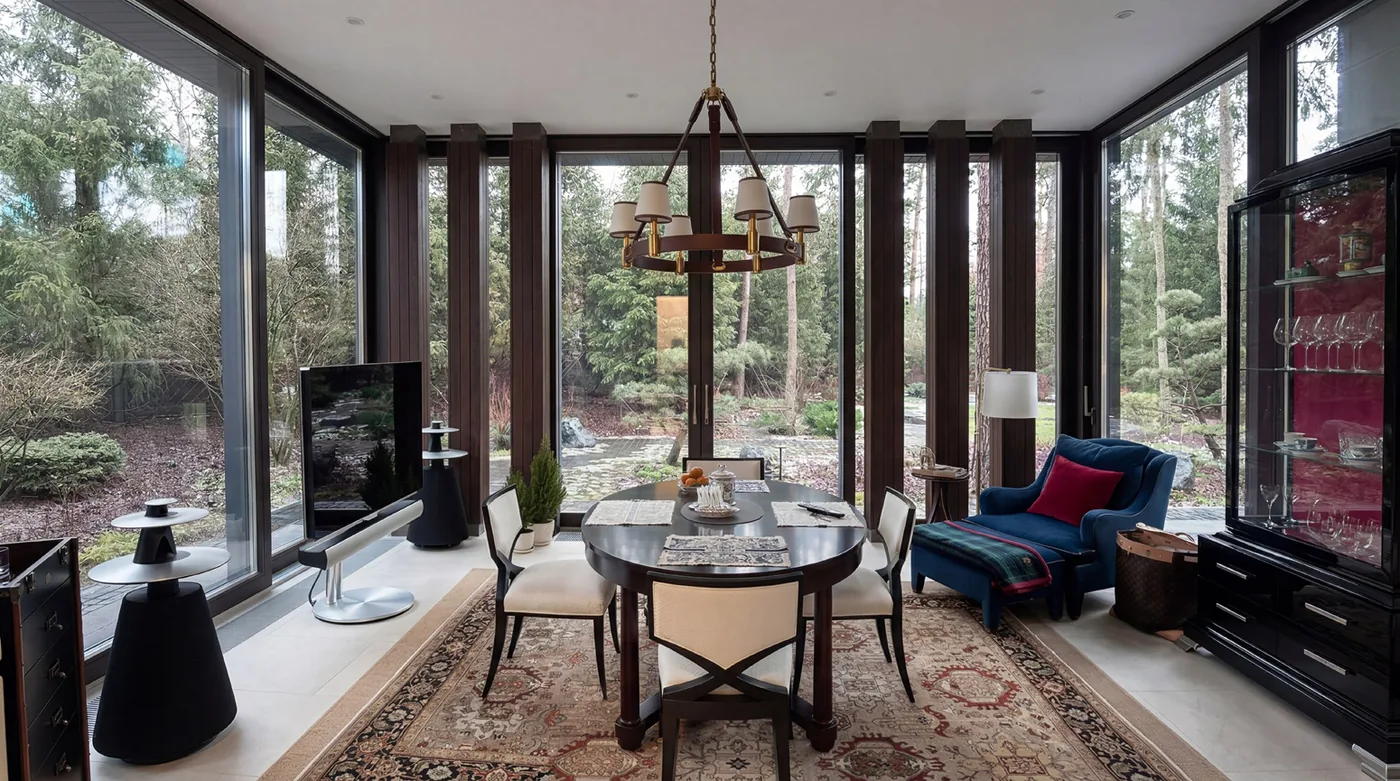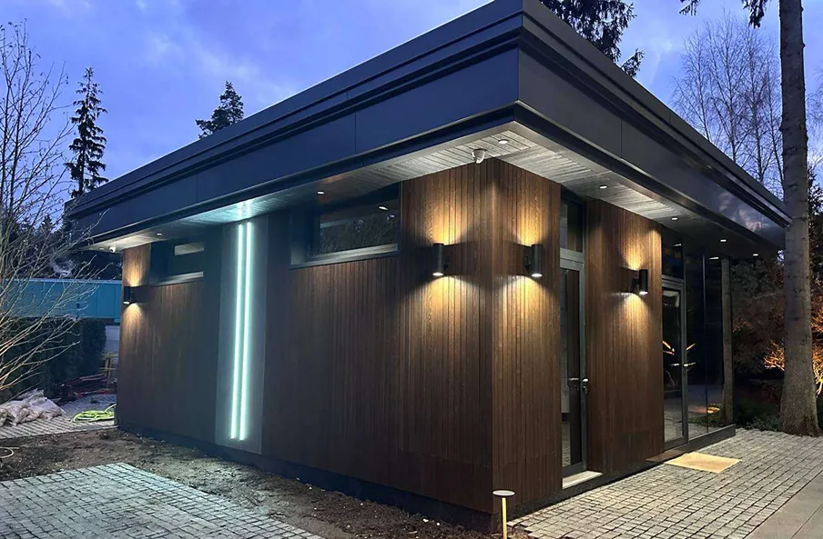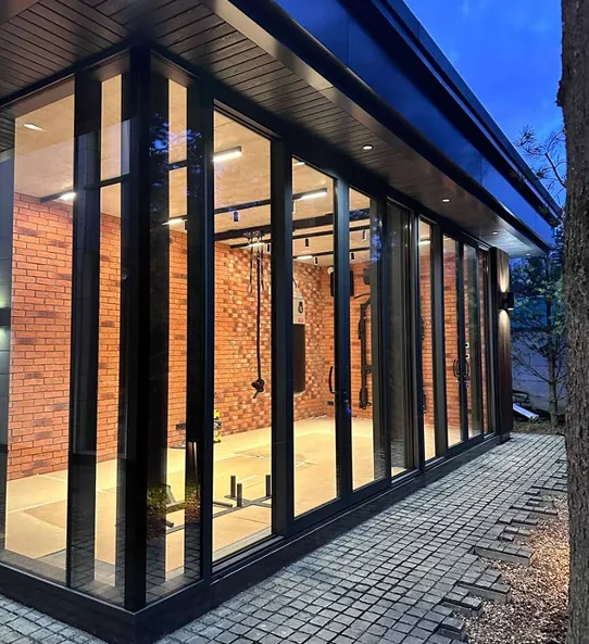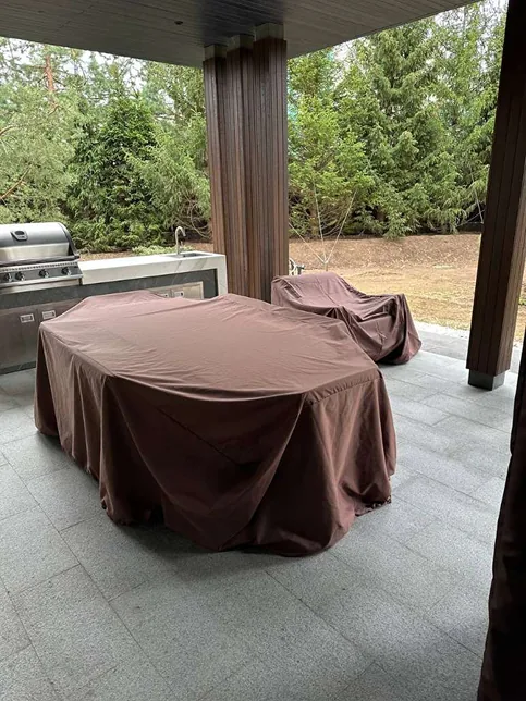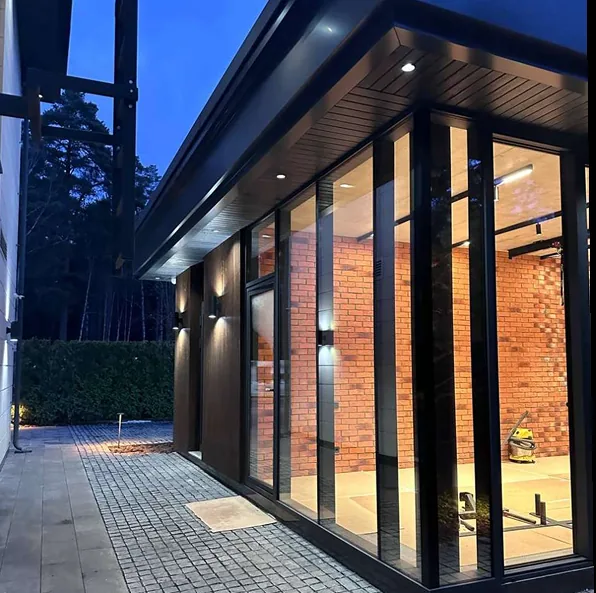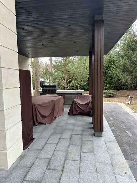 После завершения строительства и заселения владельца был реализован второй этап проекта — комплексное благоустройство участка. В рамках работ выполнено озеленение территории и высадка деревьев, построена беседка с барбекю-зоной и тренажёрным залом, а также выполнено остекление террасы с системой отопления.